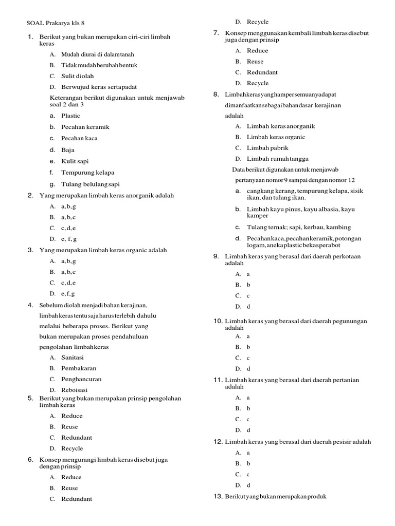 Pengolahan limbah anorganik harus melalui tahapan dalam pengolahannya dimana salah satunya adalah metode pengolahan sampah. Soal latihan ulangan 3 prakarya kelas vii. Mtsn 2 kota bengkulu ujian praktik prakarya. Konten soal yang akan diujikan terdiri dari berbagai materi baik mulai dari kelas 7 hingga kelas 9 akhir yang meliputi kerajinan. Kewirausahaan adalah suatu proses seseorang gun.